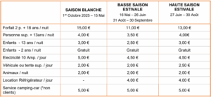Forfaits emplacement : 2 personnes – 1 véhicule – 1 tente
